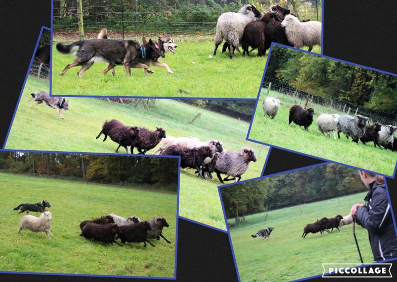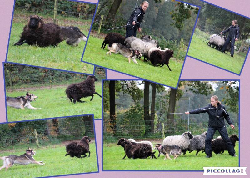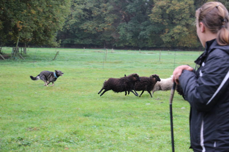 Eerst moesten de honden aan de lange lijn om te kijken hoe ze op de schapen zouden reageren, daarna mocht het hele drijven , zonder lijn plaats vinden.
